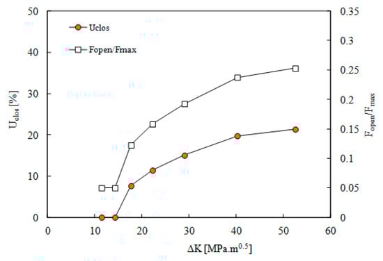 The experimental results showed a relatively low influence of specimen thickness and stress on FCGR, which indicates that the crack closure phenomenon may have a low relevance. Figure 8 presents the evolution of crack closure with the crack length. The crack closure level was quantified by two parameters: