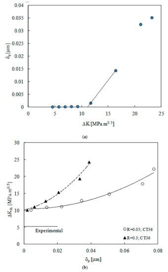 Numerical prediction of fatigue threshold. (a) Constant Kmax approach (a = 17.272 mm; Kmax = 23.4 MPa.m0.5). (b) Analysis based on the CTOD versus load plots.