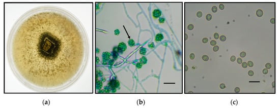 Morphology of strain FG. (a) Mycelium from strain FG grown on a potato dextrose agar (PDA) plate for 5 d; (b) A sample taken from a mycelium grown on a PDA plate and stained with lactophenol cotton blue. This sample was observed under an optical microscope using 40× magnification. Bar indicates 20 μm. Tree-like structures containing conidia can be observed (black arrow); (c) Microscopic observation of spores by an optical microscope using 100× magnification. Bar indicates 5 μm.