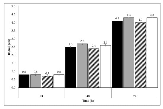 Radial growth of the Trichoderma sp. on FMWs plates.Trichoderma sp. was grown on Mandels medium supplemented with glucose (black bar), olive-mill solid waste (OMSW, gray bar), tomato pomace (TP, striped bar), and grape pomace (GP, white bar) at 0.5% as the sole carbon source. Error bars indicate the standard deviations (SDs) based on three different replicated experimental values. Numbers on the top of each bar indicate the average radius corresponding to mycelial growth.