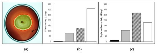 In general, the activities from the culture supernatants agreed with the mass spectrometry data. Glucose was found repressive as expected; however, five β-glucosidases were still found in the culture supernatant of this simple substrate. These results are similar to those of Gómez-Mendoza et al. who found that T. harzianum cultured with glucose presented two β-glucosidases []. These enzymes might be responsible for the residual activities seen in Figure 4c.