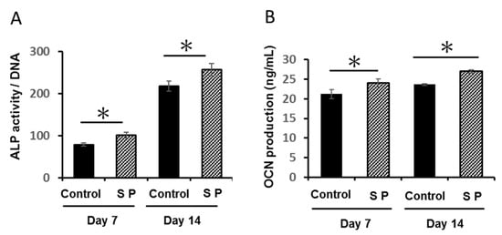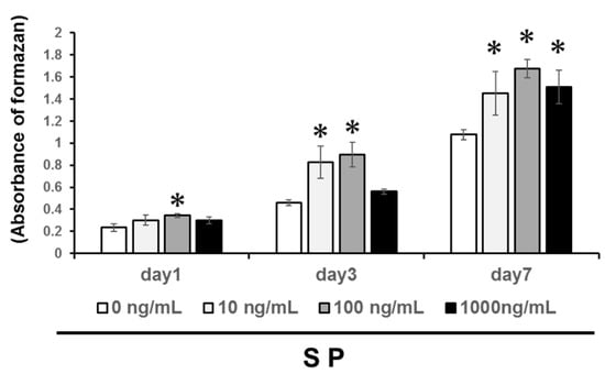 In this study, we found that a concentration of 100 ng/mL SP most enhanced DPSC proliferation; this was similar to our previous reported study []. Although, the cell proliferation at 1000 ng/mL SP was decreased compared with 100 ng/mL SP, the cell proliferation was increased compared with 0 ng/mL SP. Therefore, the concentration of 1000 ng/mL was not toxic. From these results, we used this concentration to further investigate the effects of 100 ng/mL SP on osteogenic differentiation.