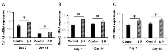 Effects of the SP on mRNA expression of (A) collagen 1-alpha 1 (COL1A1), (B) Runx2, and (C) osteonectin (ON). The gene expression was investigated by quantitative RT-PCR (* P < 0.05).