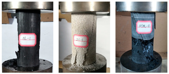Four types of rock specimens (mudstone, siltstone, fine sandstone, and medium sandstone) and two types of coal specimens were utilized. The mudstone, siltstone, fine sandstone, and medium sandstone specimens were extracted from the roof of the No. 3 coal seam in the Xinhe coal mine, Jining City, Shandong Province, in Northern China. One type of coal specimen was also taken from the No. 3 coal seam in the Xinhe coal mine (named M1 in the following section), and another type was taken from the No. 2-2-medium coal seam from the Gaojialiang coal mine, Inner Mongolia, China (named M2 in the following section). The natural specimens obtained on the site were stored in the laboratory with a plastic film for no longer than 30 days to preserve their natural water content. The siltstone and fine sandstone specimens were even textured, and the values of the siltstone and fine sandstone rock quality designation (RQD) were approximately 89% and 76%, respectively. The medium sandstone was locally interbedded with thin beds of siltstone with an RQD of 66%, while the mudstone specimens locally contained clasts of plant fossils with an RQD of 45%. The coal specimens taken from the Xinhe coal mine were simple in structure with high strength, while coal specimens taken from the Gaojialiang coal mine had a low uniaxial compressive strength. The bulk density of the coal specimens varied in a small range from 1.56 to 1.65 g/cm3. The representative porosity of the specimens was 18.6%.