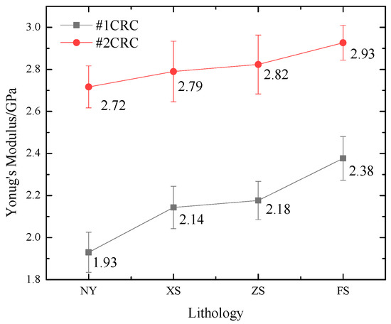 Figure 4 illustrates the influence of the rock/coal strength on Young’s modulus. As the pure rock strength increases, the Young’s modulus tends to increase. When the coal sections of the CRC specimens were M1 and the rock section was mudstone, the average Young’s modulus of these types of CRC specimens was 1.93 GPa. However, for the M1 and fine sandstone specimens, the average Young’s modulus was 2.14 GPa. Moreover, with increasing coal strength, the average Young’s modulus also tended to increase. For example, the average Young’s modulus of a specimen of M1 and fine sandstone was 2.14 GPa, while that of a specimen of M2 and fine sandstone was 2.79 GPa, approximately 30.4% higher than that of the former. These phenomena indicate that the higher the uniaxial compressive strength of the pure rock/coal specimen is, the greater the stiffness is and the less likely it is to deform.