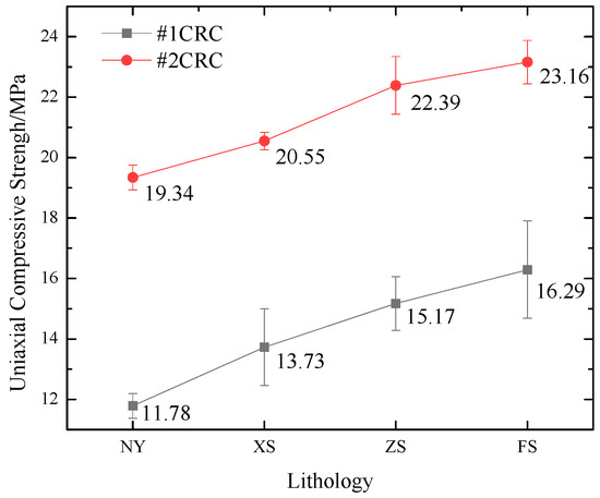 The uniaxial compressive strength average values of the CRC specimens are presented in Figure 5. The results indicate that the uniaxial compressive strength of the CRC specimens depends on the pure coal strength. For all CRC specimens, the uniaxial compressive strength increased with increasing coal section strength and appears to be independent of the rock section strength. These findings agree with the results reported by Zuo et al. [35]. During the process of quasi-static loading, the coal part generally exhibits relatively weak properties compared to the rock part. Thus, it can be expected that the weak properties of coal contribute significantly to the bearing capacity of the CRC specimens once loaded. In addition, the uniaxial compressive strength of these specimens is not similar, but instead is greater than that of the corresponding pure coal specimens M1 and M2. This is because when the CRC specimens were loaded, the upper rock section share part of the load so that coal section bore some another part of the load. Therefore, bearing capacity of CRC specimens is greater than that of pure coal specimens.