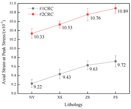 Figure 6 shows the statistical values of the axial strain corresponding to the peak stress (ASPS) values in different CRC specimens. First, for all CRC specimens, the ASPS was less than that of the pure rock specimen but slightly greater than that of the pure coal specimen. This result was because the stiffness of CRC specimens was located between the stiffness of the pure rock and coal specimens. Therefore, when the same load is applied, the ASPS of CRC specimens increased correspondingly. In addition, for the CRC specimens with the same coal specimen, for the M1 specimen, as the rock specimen strength increased, the ASPS varied from 9.22 to 9.43, and the growth rate was 2.3%. However, for the CRC specimens with the same rock specimen (such as mudstone), as the coal specimen strength increased, the average growth rate was 12%, which was higher than the former. The findings illustrate from the other side that the strength properties of CRC specimens depend mostly on the coal strength, and the dependency of the rock strength is weak.