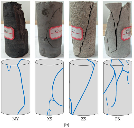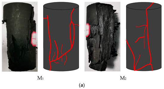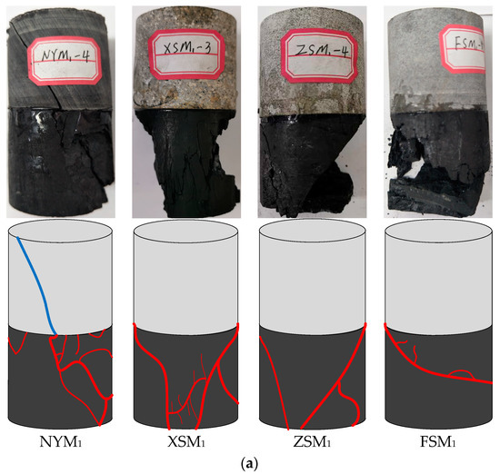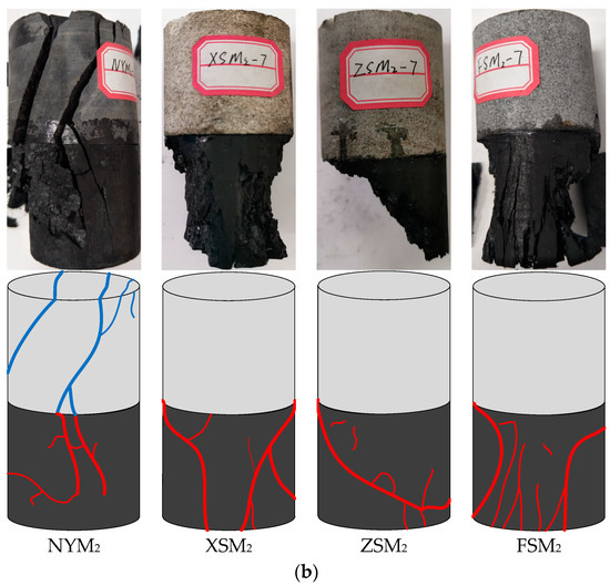 Figure 8 presents photos of failed CRC specimens with different coal/rock sections. When examining the distribution of the macroscopic failure shown in Figure 8 involving CRC specimens with mudstone sections, it can be seen that the coal section failed due to typical shear failure with a single fracture surface, and the macroscopic single shear failure in the coal section extended to the rock section. Then, the rock section was broken into two parts, which failed lightly compared with the coal section. With increasing rock section strength, the coal section was broken more thoroughly, whereas the rock section was not broken. For CRC specimens with a fine sandstone section, a “Y” type fracture surface was observed in the coal section, implying that this specimen exhibited a shear fracture failure mode with local axial splitting cracks. However, the failure mode of the CRC specimens with medium sandstone and siltstone exhibited a splitting fracture, which was significantly different from that obtained in the former. It can be inferred from this typical failure mode that the final destruction of the coal section is dominated by axial splitting cracks. After the CRC specimens were loaded, the coal section has the potential to expand laterally, and the relative deformation between the rock and coal section provides horizontal confinement to the coal pillar expanding laterally. With an increase in the compressive strength of the rock section, the magnitude and range of confinement stress within the coal section increased more rapidly, and as a result, lateral tensile rupture easily occurred in the coal section. Generally, in underground coal mines, the coal pillar located in the hard roof showed the progressive spalling and slabbing nature of the failure process after mining, which is in good agreement with the experimental observations. In addition, for our CRC specimens with different coal sections, with increasing coal sections, the failure mode did not change. The most obvious difference is that the coal section with higher compressive strength has greater brittleness, so the coal part was more thoroughly broken.