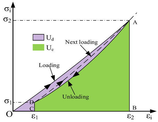 Based on the stress-strain curve of the specimen under uniaxial cyclic loading and unloading compression, we can determine the stored energy U, released elastic energy Ue and dissipated energy Ud at each cyclic loading and unloading compression, as shown in Figure 9. The stored energy U (OAB) of the specimen is represented by the area under the loading stress-strain curve. The released elastic energy Ue (ABCD) at point A is represented by the area under the unloading stress-strain curve. The area between the loading and unloading stress-strain curves represents the dissipated energy Ud (OADC). According to the method suggested by Meng et al. [36] and Peng et al. [26], the stored energy U and released elastic energy Ue can be determined by the integral of the corresponding stress-strain curves. Based on the definition of integral calculus, the equations for the related energies are as follows:
