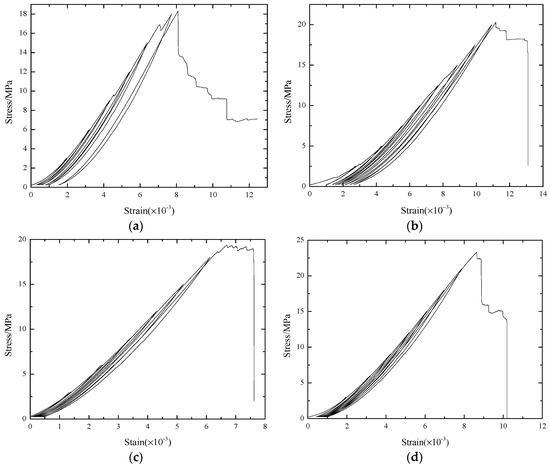 Uniaxial cyclic loading and unloading compression tests have been carried out to obtain the dissipated energy Ud and the released elastic energy Ue at peak stress. Figure 11 shows the complete stress–strain curve of the CRC specimens under uniaxial cyclic loading and unloading compression, and the results agree well with the experimental results by Yang et al. [38]. We focused mainly on the variation in the dissipated energy Ud and the released elastic energy Ue.