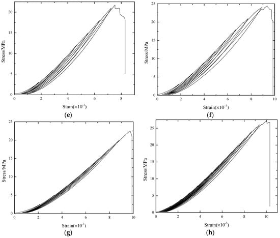 The complete stress–strain curve of the CRC specimens under uniaxial cyclic loading and unloading compression: (a) NYM1-3; (b) NYM2-6; (c) XSM1-5; (d) XSM2-6; (e) ZSM1-4; (f) ZSM2-6; (g) FSM1-3; (h) FSM2-7.