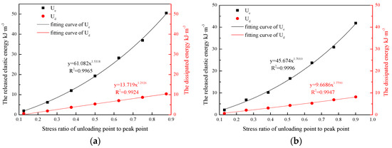 First, using the methods described in Section 4.1, the released elastic energy Ue and dissipated energy Ud were calculated at each cyclic loading and unloading compression. Then, to model the growth of Ue and Ud with the stressed state, the Ue and Ud of the CRC specimens were fitted accurately using an power function, the typical fitting curve of Ue and Ud are shown in Figure 12 and the model parameters are listed in Table 3. The correlation coefficients range from 0.9658 to 0.9999, indicating that the proposed formula produces accurate results. Third, the proposed formula was used to accurately estimate Ue and Ud when the peak strength is known. Table 3. shows the variation in the released elastic energy Ue and dissipated energy Ud with the rock/coal strength.