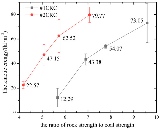 To further reveal the dependence of the kinetic energy on the rock/coal strength, the variation in the kinetic energy with the rock/coal strength is shown in Figure 13. The X-axis is the ratio of the rock strength to coal strength. In Figure 13, it can be observed that for the CRC specimens with the same coal section, the greater the difference in strength between the rock and coal is, the larger the kinetic energy is. Generally, the rock section with a higher strength has a greater ability to store elastic energy. When the CRC specimens with a higher strength rock section were loaded, the rock section accumulated more elastic energy than the coal section stored. Once the CRC specimens fail due to loading, some elastic energy stored in the rock section is released into the coal section, and the coal section is broken. Therefore, energy release was due to the difference in strength between the rock and coal.