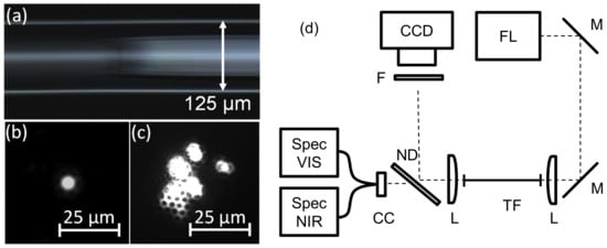 A particular challenge was efficiently coupling the high intensities of pump light necessary for SC into the cladding modes of the fiber. However, a tapered-fiber method was developed [16], which aided significantly in the process. Figure 2a shows a tapered section of the ESF which was created with the arc of a fusion splicer, while the fiber was fixed at each end but not under initial tension. The fiber was then cleaved at the center where the air holes had completely collapsed. At the in-coupling side, this taper formed a solid piece of glass which allowed the light to be pulled from a Gaussian focused, solid profile into the more complex mode-intensity profiles of the cladding modes. The light of a diode seeded picosecond fiber laser (FL) (IPG Laser, Burbach, Germany), with a pulse length of 180 ps operating at 1060 nm (up to 330 kW peak power and 22.5 W average power) was launched into to the cladding. A small numerical aperture lens was selected to match the taper angle of 2.99 degrees and the laser, M2 = 2, was focused with a 1/e2 spot size of about 45 µm (w0 = 22.59 µm, NA = 0.06 and a Rayleigh length of 187 µm) onto the collapsed part of the fiber. Figure 2b,c shows the output of the fiber at the pump wavelength after adjusting the system to couple into the core-guided mode and cladding modes.