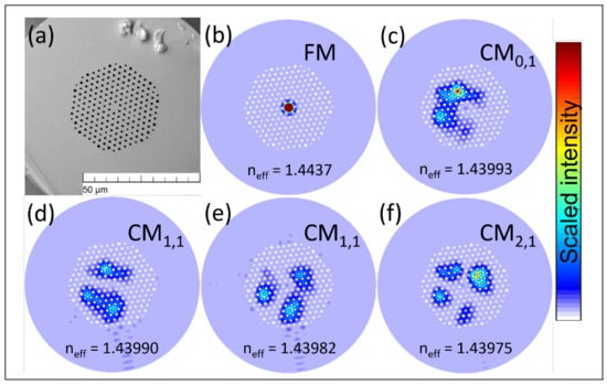 The single-mode propagation of light over a wide spectral range distinguishes ESF from conventional step index fibers. Besides the fundamental mode of an ESF, cladding modes can also occur and overlap spatially with the core. The core-guided mode is the only mode that is strongly localized and bound to the center of the fiber and very weakly interacts with the edge of the cladding-coating interface. The modes which overlap mostly with the photonic crystal region (the ones we refer to as cladding modes) require an additional reflection with the cladding–coating interface to achieve optical guidance. Despite that fact, they still have negligible propagation losses over distances of a few meters. The cladding ESF modes, as seen in Figure 3c–f, display similar symmetry to that of their multimode fiber counterparts [4], and are labeled with similar angular and radial quantum numbers. Numerical solutions to these modes push the boundaries of the finite element method and such calculations usually involve exploiting a 4-fold symmetry to aid in reducing the memory and time complexity required for the solution. This can be seen in how precise the effective index must be calculated. For the calculations performed in this manuscript, however, the 4-fold symmetry was relaxed. The modes seen in Figure 3c–f seemingly do not contain the proper mode-field distribution that their labels would suggest due to the somewhat random nature of the hole size and spacing in the photonic crystal; however, the calculated phase profile was used as an indicator for mode classification. Based on the scanning electron microscopic image (see Figure 3a) the intensity distributions of the fundamental mode (FM) and the first cladding modes (CMi) were simulated and shown in Figure 3b–f.