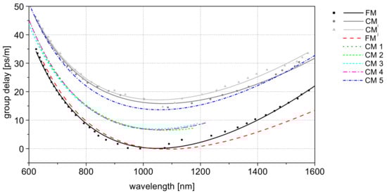 Measured (markers), fitted (solid) and calculated (dashed lines) curves of the group delay in the ESF for a 0.461 m length of the fiber. FM, fundamental mode and CMi, arbitrarily labeled cladding mode.