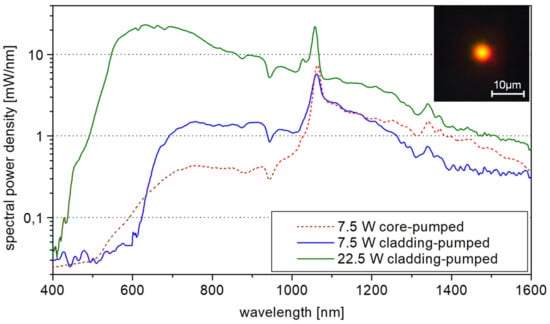 To demonstrate the differences in single-mode SC generation from that in the multimode generation, as well as show that an SC could be generated in the cladding modes (as opposed to the scenario where the continuum was generated in the core and scattered from the core-guided mode to the cladding), the pump light was first coupled into the core-guided mode. The resulting SC spatial pattern of the output can be observed in Figure 5 (inset). As is visible in the spectrally integrated pattern, most of the light generated inside the core-pumped case remained there. The red, dashed curve in Figure 5 shows the spectral power density of the core-guided SC generation when pumped just below the damage threshold for that configuration. The power limitation of this arrangement, as well as the cladding-pump arrangement, was determined by the coupling losses heating the end of the fiber, which would cause enough thermal expansion inside of the ceramic holder to fracture the fiber. It can be seen that the core-pumped intensity in the Raman continuum (generated in the anomalous dispersion regime at wavelengths longer than the pump) is almost one order of magnitude greater than the SC generated on the shorter wavelength side of the pump.