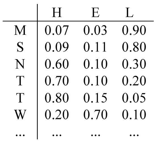 The size of the PSI-BLAST and HHMAKE PSSMs are N by 20 and the size of the structural profile matrix is N by 3, where N is the number of amino acids in the target protein. Each row of PSI-BLAST and HHMAKE PSSM contains the propensity of observing one of the 20 amino acids at a particular amino acid of the target. On the other hand, each row of structural profile matrix and the three distributions in Section 3.4 contains the probability of observing the three secondary structure labels at a particular amino acid of the target. An example structural profile matrix is shown in Figure 2. In the present study, only distant templates are used to construct structural profiles matrices by removing templates for which the percentage of sequence identity score with respect to target is greater than 20%. Once the profile matrices are obtained they are scaled by sigmoidal transformation to transform the features to the range [0, 1], which are sent as input to DSPRED method for classification. Details of feature extraction can be found in Aydin et al. [9] and the thesis work of Görmez [34]. Details of weighted frequency computation for deriving structural profile matrices can be found in Reference [35].