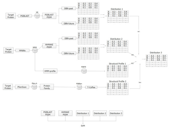 To predict the secondary structure class of each amino acid, the DSPRED method is used, which employs separate dynamic Bayesian network (DBN) classifiers for PSI-BLAST and HHMAKE PSSMs. Each DBN model produces a marginal a posteriori distribution (called Distribution 1 and 2) of class labels given the input features. These distributions are combined with structural profile matrices through model averaging to obtain Distribution 3 [11]. In this work, the one-sided amino acid window of DBN classifiers is set to and the one-sided secondary structure history window is set to . In the next step, PSI-BLAST PSSM, HHMAKE PSSM, Distributions 1, 2 and 3 are used as input features of the SVM classifier. To predict the secondary structure class, a symmetric window of size 11 is taken around each amino acid and features in this window are concatenated to obtain a total of 539 features (PSI-BLAST PSSM: features, HHMAKE PSSM: features, Distributions 1–3: features). The steps of the DSPRED method are shown in Figure 3. Note that in the present work the second structural profile matrix is not employed (i.e., is set to 0). Details of DSPRED can be found in Aydin et al. [9,11] and the thesis work of Görmez [34].