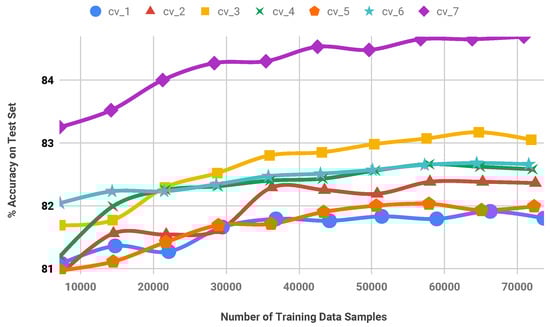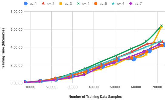 Table 1 summarizes the overall prediction accuracies of the stratified random selection method using the various training samples and k-fold (k = 7) cross-validation. In this table, D represents the sampled dataset as a percentage, S represents the randomly and uniquely selected rows, denotes the overall accuracy in percentages (i.e., ) on validation sets and is the training time in hours, minutes and seconds, is the prediction time in minutes and seconds.