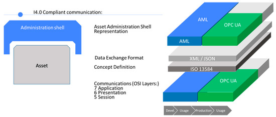The German Federal Ministry of Economic Affairs and Energy [34] provides specifications for the exchange of information with the administration shell. The Open Platform Communications Unified Architecture (OPC UA) is the core communication standard for I4.0 compliant communications. Both client/server and publish/subscribe communication patterns are supported, as highlighted in [34]. Figure 2 shows the I4.0 communication protocol stack.