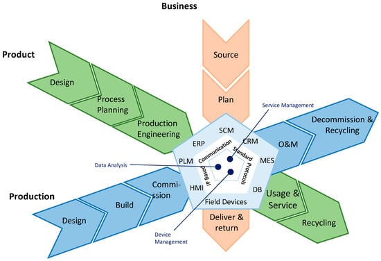 - Product Lifecycle Management (Product): Includes six phases for the product development lifecycle (design, process planning, production engineering, manufacturing, use and service, end-of-life, and recycling). This perspective is equivalent to the RAMI 4.0 Life Cycle and Value stream dimension.