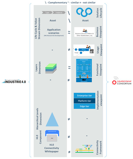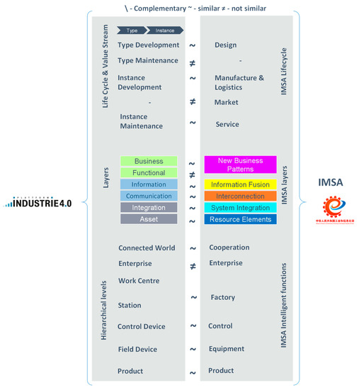 The German Federal Ministry of Economic Affairs and Energy [44] provides a description of the IMSA Reference model dimensions and element-to-element alignment to RAMI 4.0. The main conclusion from this document is the high level of alignment between both specifications: the three dimensions in both reference models are almost equivalent in scope, and the different elements in each dimension can be mapped almost one by one from one reference model to the other. Figure 5 summarizes the results of the mapping, using the same structure, symbols, and legends as Figure 4.
