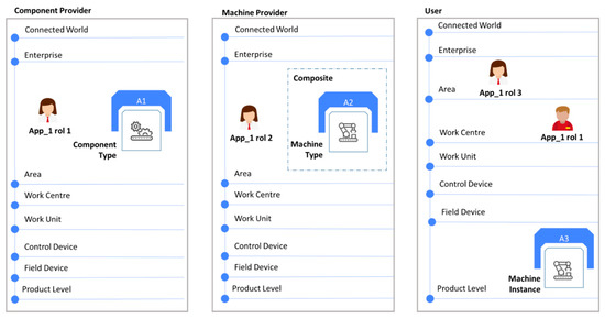In the example, there are two different kinds of parties, humans and assets. Humans are represented together with their corresponding user roles (named App_1_n, n = 1, 2, 3 in the figure). Each asset (or group of assets) is associated to an Asset Administration Shell (AAS), which comprises the digital representation of the asset to conform an I4.0 component (A1, A2, and A3 in the figure).
