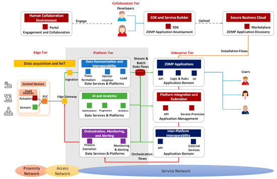 Figure 10 illustrates the mapping of a digital manufacturing platform, the Zero Defect Manufacturing Platform (ZDMP), to the proposed four tier architecture pattern. The ZDMP platform provides a marketplace and Software Development Kit (SDK) to develop applications to realize the zero-defects manufacturing paradigm in manufacturing companies [51]. The ecosystem is supported with a portal and engagement hub to promote the collaboration between stakeholders (mainly software developers and manufacturing companies). This is an example of a digital manufacturing platform with collaboration features that cannot be mapped into IIRA’s three-tier architectural pattern. The figure shows how the high-level building blocks of ZDMP are mapped to the four tier architecture pattern. The new collaboration tier is convenient for providing an abstracted view of the system that is common to many collaborative use cases, but with a margin for variations to capture specificities.