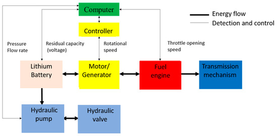 At present, even though the designs of hybrid power machinery have been developed, which can be reviewed in academic papers [16,17,18,19], in the market, only large-scale machines have products with gas–electric hybrid power systems. The large-scale dozer (D7E, Caterpillar, Peoria, IL, USA) is equipped with a diesel–electric hybrid power system. The output of the flywheel is 238 hp and the machine has a longer operating time than general dozers. The excavator (ZH200, Hitachi, Tokyo, Japan) is equipped with a diesel–electric hybrid power system. The output of the flywheel is 154 hp and can also provide a longer operating time. Despite the fact that the hybrid power can meet the demand of green energy, the mini-loader vehicles and typical hybrid vehicles have large differences includes the structure, transmission, weight range, load, and energy consumption. The mini-loader vehicles use a hydraulic system to drive the working devices, the load varies greatly during working operation, and energy consumption characteristics are more complex. Therefore, the previous researches of typical hybrid vehicles cannot be directly applied to mini-loader vehicles.