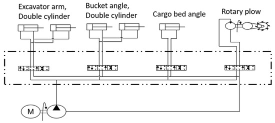 To reduce greenhouse gas emissions from the ICE, this design employed an electricity-driven electric hydraulic pump. According to the design target, the DC power pack of the hydraulic pump (Smiths Hydraulics) was selected. Operators can control the current to adjust the rotational speed, flow speed, and flow rate. According to the specifications of the pump, the rated output is 2 kW. At a maximum current of 150 A, it can output 2.5 kW, the working pressure can reach 170 bar, and the system displacement can reach 2.6 c.c./rev. Detailed specifications are shown in Table 5. The design of the hydraulic pipeline is shown in Figure 3. There are two hydraulic cylinders, one each on the left and right sides of the bucket arm and the bucket. The cargo bed has a hydraulic cylinder, and the hydraulic system drives the rotary plow. The hydraulic valve has a maximum operating pressure of 315 bar, a maximum backpressure of 25 bar, a fluid temperature range of −20 to 80 °C, a viscosity range of 15 to 75 (), and an ambient temperature range of –40 to 60 °C. These features meet the maximum pressure requirement of 170 bar required for the hydraulic pump. The tool module has dual hydraulic mechanical arms and a built-in power source that can drive the excavation and transportation module of the hydraulic cylinder. The mechanical arm has 3 degrees of freedom, a 0.6 m arm length, and a 100 kg load. It combines the function of trucks, excavators, and dozers and can be used not only for agriculture but also for disaster relief and civil engineering.