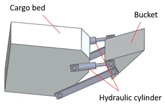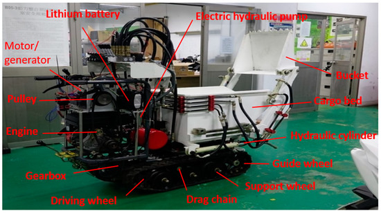 The complete assembly of the multifunctional mini-loader vehicle is shown in Figure 6. It contains the fuel engine, the motor module, the battery module, and the controller module are mounted on the platform to complete the mechanical assembly of the hybrid power system. Moreover, the assembly of the hydraulic system and the tool modules, which include the electric hydraulic pump module, the hydraulic valve module and the bucket hydraulic cylinder, and the cargo bed hydraulic cylinder.