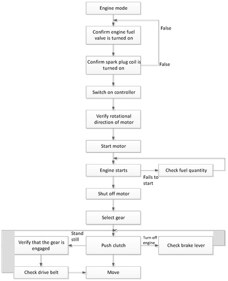 The tests of the hybrid power system include testing the engine, the hybrid power, and the battery mode. The steps involved in testing the engine mode is shown in Figure 7. The test first confirms that the engine fuel valve and the spark plug coil switch have been turned on. The controller is switched on, and the rotational direction of the motor is verified. The motor speed knob is turned; as the motor rotates, the engine ignites and starts successfully. If the engine does not start, a dipstick is used to check whether the fuel quantity is sufficient. After the engine starts, the motor is shut down, and the motor is converted to a generator to charge the battery. For battery charging, this study limits the maximum charging current to 5 amps and sets the charging mode to be turned on when the state-of-charge (SOC) is less than 60%. The measured charging current is shown in Figure 8. When the motor rotates, it consumes about 10 to 12 amps of current. When the motor is turned off, it becomes a generator, and the charging current is stable at 5 amps. At 30 s, the charging current suddenly drops. The reason is that the clutch is being connected and the low gear is engaged to move forward, which slows down the rotational speed slightly. By engaging the throttle, the current can be maintained at 5 amps.