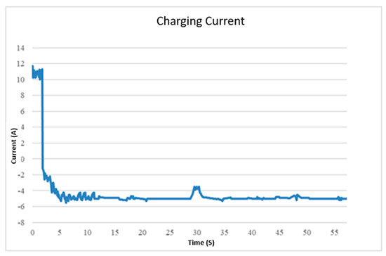 In Equation (5), SOC is 60%, the charge is 12 Ah after charging is completed, and the average motor current is 10 A. The experimental record is shown in Figure 9. Therefore, it can be calculated that the battery has been used for 4.8 Ah and 28.8 min. This demonstrates that when the battery is used from 100% to 60%, the motor can run continuously for approximately 30 min. For the battery charging test, it takes about 40 min to charge to a residual capacity of 90% after switching to the engine mode.
