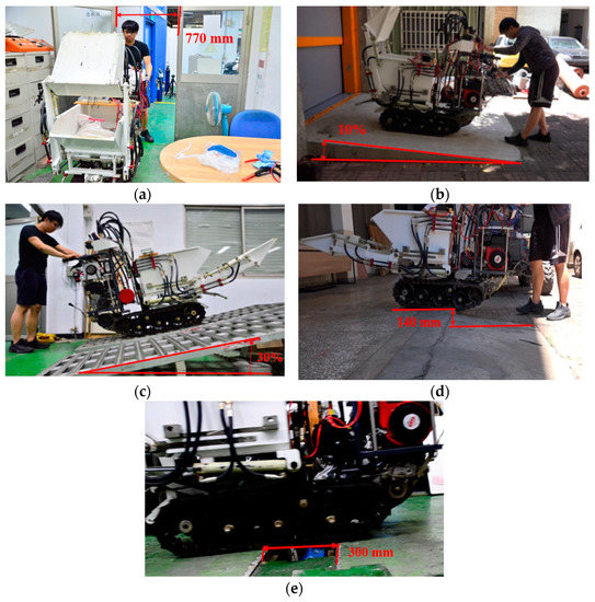 To understand the actual operation of the multifunctional mini-loader vehicle, the following field verifications are carried out according to the design specifications. The test results in Figure 10a demonstrates that the vehicle has the ability to operate in and out of a room with a door width of 770 mm. Figure 10b,c illustrates the ability of the vehicle to climb slopes, including 10% and 30% slopes. Figure 10d establishes that the vehicle has the ability to cross obstacles when encountering a threshold or a short step. This is tested by making the vehicle cross a short step of 140 mm in height. Figure 10e verifies that the vehicle can continue to operate when encountering puddles or potholes. This is tested by driving the loader through a trench of a certain width. After testing, the loader can successfully cross a 300 mm trench.