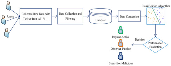 Twitter is a popular social media platform that is used both as a social network and a microblog. Twitter users interact with others through short texts called tweets. In addition to official institutions and organizations all around the world, twitter is actively used by heads of state, ministers, party leaders, significant political figures, celebrities, athletes, and trademarks. Twitter is the most prestigious microblog due to its corporate identity and to the effective self-expression and interaction opportunities it allows. It played a determining role in social events such as the Arab Spring, where demonstrators organized and made their voices heard [3]. World leaders express their feelings and thoughts about important situations by means of Twitter. A tweet can raise the stock market, make governments fall, or create social movements followed by millions of people. Twitter is consistently dynamic, up-to-date, and versatile in terms of political, social, and economic aspects, and it includes rich content supplied from different sources. Therefore, by considering user profiles, the analysis of the data obtained can be used to obtain value-added information. The processing of data obtained from social network resources aids the discovery of valuable knowledge. On the other hand, it is important—in terms of accurate analysis and accurate results—to verify these accumulated data, in order to ignore or prevent interactions arising from fake profiles and use real interactions sourced from real people. Interactions such as membership information, friendship relations, shares, likes, and the comments of social network users are valuable data. Social network analyses on these scalable data can reveal relationship structures, interactions, aggregations in the network, profile asset values, and confidence indices based on the behavioral analysis of users [4]. Consistent, real, and comprehensive data is essential for effective knowledge discovery. Consumers want to review comments, likes, or complaints of other users before purchasing products and services [5]. At this point, the following are important examples of creating fake interactions. It was determined that interactions such as comments, likes, and product views made on e-commerce sites such as Amazon and Alibaba, as well as one-third of the comments made on Trivago, were misleading and obtained from fake profiles [6]. The same situation is repeated frequently for brands, people, situations, and products through fake and bot accounts on social media. The main goal of spam-bot-malicious accounts is to influence users’ opinions and thoughts about politics, products, and services on social media. By using fake profiles, various actions such as distributing disturbing content, false news and comments, misleading surveys, and attempting to damage reputations or create a false reputation is possible [7]. Fake profiles can manipulate ideas and cause misleading results. Directing user habits, as well as creating interactions for changing thoughts, can misdirect ideas and thoughts.