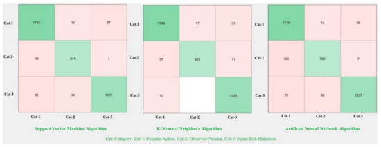 According to the classification results, the average accuracy value is 94.17% for the SVM algorithm, 96.81% for the K-NN algorithm, and 92.23% for the ANN algorithm. In the K-NN algorithm, showing the highest overall accuracy value, the accuracy value is 97.09% for the popular-active class, 97.88% for the observer-passive class, and 98.65% for the spam-bot-malicious class. Examining the F1-Score parameter, which is the harmonic average of precision and sensitivity, and which indicates the overall accuracy of the classification, the highest accuracy was obtained by the K-NN algorithm. The results obtained with K-NN for all classes are higher than the F1-Score values obtained for the other algorithms.