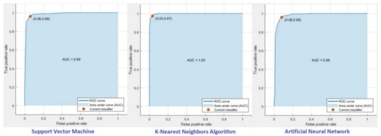 ROC curves, another indicator of performance measurement in classification, were obtained for each algorithm. Examining the ROC curves, the AUC value of the K-NN algorithm is close to 1. The ROC curve shows that the success of the K-NN algorithm in predicting the class of profiles is clearly distinguishable from other algorithms. SVM and ANN algorithms had AUC values of 0.99 and 0.98, respectively, while the highest value (1.0) was obtained with the K-NN algorithm.