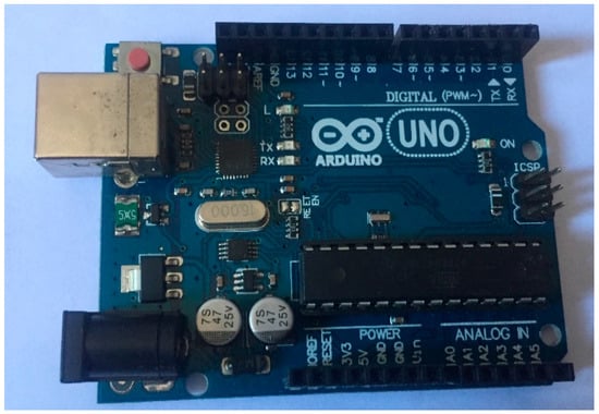 An Arduino board is an electronic card that can be programmed to analyze and produce electrical signal, to perform a variety of tasks such as home automation, driving a robot, embedded computing, etc. It is a platform based on a simple input/output interface. In addition, Arduino cards have serial communication interfaces, including a universal serial bus (USB) on some models, which are also used to load programs from personal computers. Figure 4 shows the Arduino Uno card.