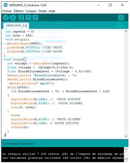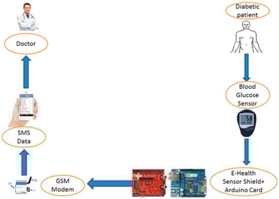 In this system, we describe the general scheme of the proposed system (Figure 6). The patient can perform a measurement of blood glucose using the blood glucose sensor. After the measurement, the results of the glucose level in the blood will be obtained for the patient. The measurement data is automatically transmitted by the blood glucose sensor that is connected in serial mode with the Arduino card. The data processed by the Arduino card’s microcontroller is automatically transmitted to the GSM modem that has been integrated into the Arduino board to send the measurement results to a specialist doctor via SMS.