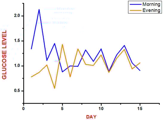 The data measured by the glucose sensor are processed by the Arduino card and sent directly to the patient’s smartphone via Wi-Fi or 4G, which in turn sends these data daily to the cloud and to the smartphone of the doctor. The monitoring center has the right to access data from the cloud via local connection. Table 1 shows the value of glucose levels measured with the glucose sensor and processed by the Arduino Card into 15 days for one diabetic patient with an average of two times per days.
