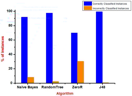 As seen in Table 2, the comparison between the algorithms like ZeroR, RandomTree, J48, and naïve Bayes for the correctly classified instances was higher than the incorrectly classified instances in terms of accuracy. Figure 10 shows a bar graph that represents correctly and incorrectly ranked instances of the algorithms used.