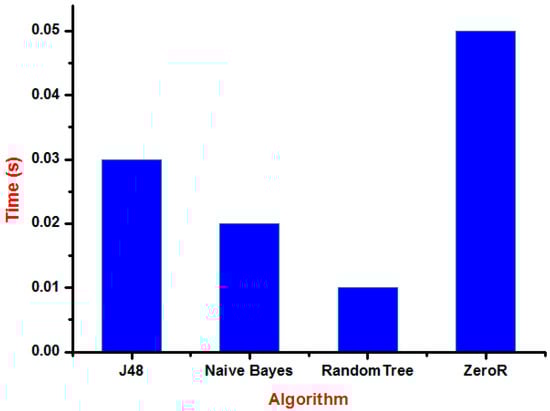 Figure 11 shows the time graph of various classification algorithms. The longest time was taken by ZeroR consuming a time of 0.05 s and the shortest time was taken by RandomTree consuming 0.01 s only.