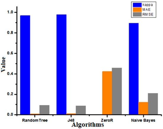 Figure 12 represents Kappa statistic, MAE (mean absolute error), and RMSE (root mean squared error) values for the chosen classifiers. The naïve Bayes algorithm showed better results for MAE and RMSE, and the J48 algorithm showed a better value for the Kappa statistic.
