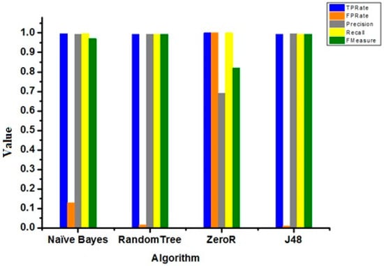 The accuracy of algorithms (shown in Table 3 and Figure 13) was measured with the help of parameters such as false positive rate, true positive rate, recall, precision, and F-measure. These parameters are defined as follows: