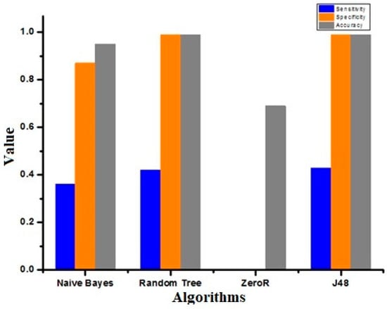 Figure 15 represents the sensitivity, specificity, and accuracy of different algorithms. The sensitivity, specificity, and accuracy for J48 were better than for other classifiers.