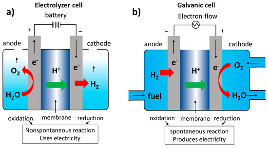 Components of electrochemical cells. (a) Electrolyzer cell (electrolytic) and (b) hydrogen cell (galvanic cell).