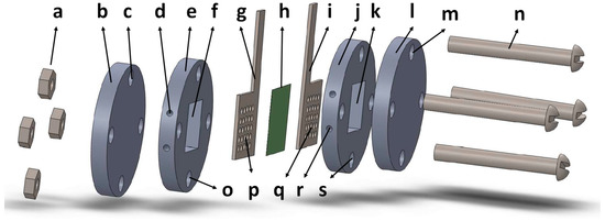 Conventional electrochemical cell of two chambers. a, nuts; b, l, Nylon covers; c, m, o, s, screw holes; d, r, oxidant and reducer agent input and products and excess reagent output, respectively; e, j, structures of the oxidation and reduction chambers; f, k, chamber cavities for oxidation and reduction; g, i, stainless steel electrodes of the electrolyzer cell, and which are both coated with Pt particles for the fuel cell; h, bio-membrane of the agave cuticle; n, screws; p, q, holes within both stainless steel electrodes (g and i) to achieve good contact among the reagent, electrode and membrane.