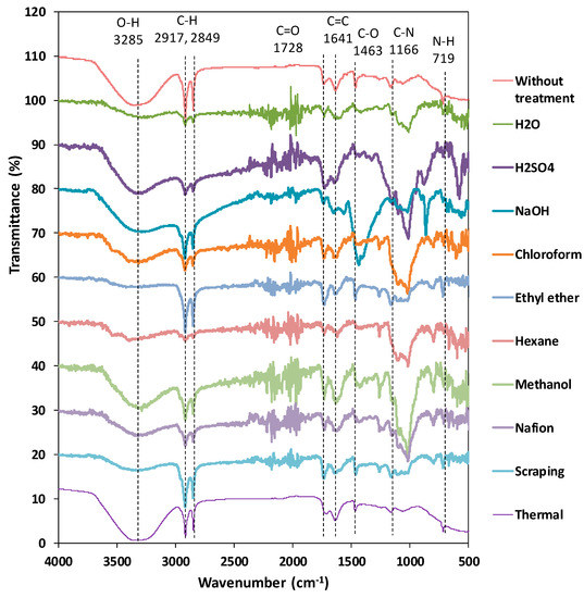 Fourier-transform infrared spectroscopy (FTIR) spectrum of the several treatments of the bio-membrane: Without Treatment, Immersion (H2O, H2SO4, NaOH), Clean-up (Chloroform, ethyl ether, Hexane, methanol), Polymeric Coating (Nafion), Scraping and Thermal.