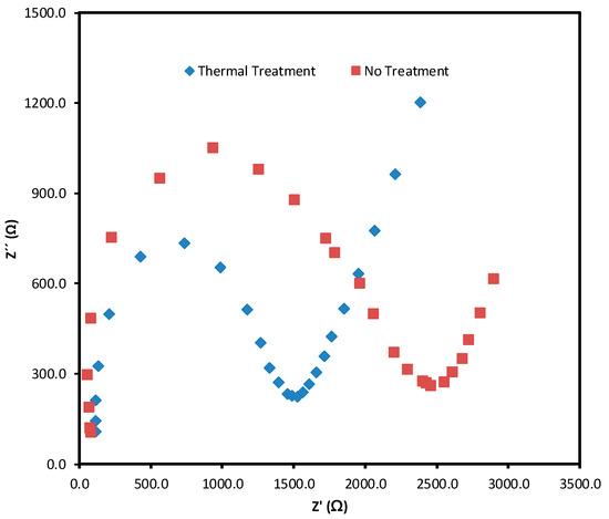 One way of corroborating that there is a conductive improvement (efficiency) in a modified bio-membrane is to record an impedance spectrum using four electrodes at 0.2 V. Figure 5 shows a decrease in the electrical resistance of the thermally-treated bio-membrane, which indicates an increase in ionic conductivity, and therefore in its efficiency, which makes it an option as a bio-membrane in an electrolyzer or fuel cell [21,22].